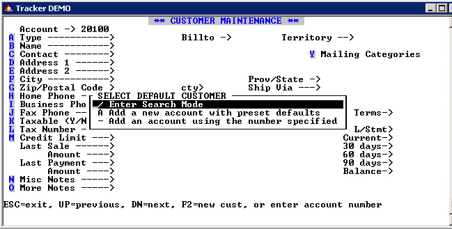The actual entries in the SELECT DEFAULT CUSTOMER menu will depend on how it was configured by your Tracker Installer/Administrator.